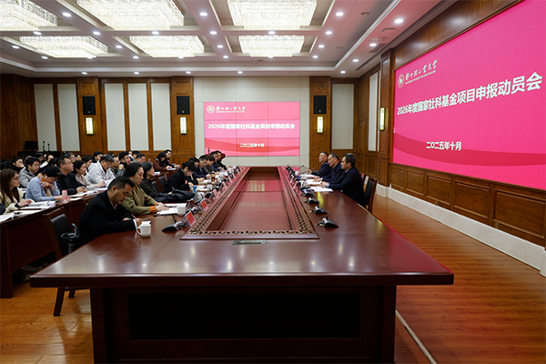 10月20日上午,学校召开2026年度国家社科基金申报动员会。校领导魏世忠、肖艳秋出席会议,各人文社科学院负责人、主管科研副院长、人文社科重点研究基地负责人、人文社科学院博士代表、社会科学管理处全体成员参加会议。会议由副校长肖艳秋主持。