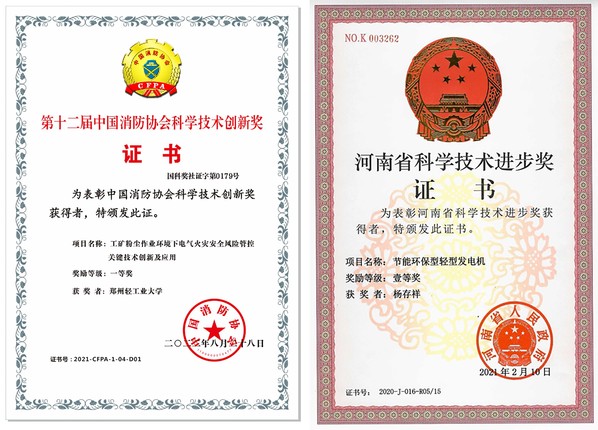 构建校企协同育人共同体,与国网河南省电力公司、中国烟草总公司郑州烟草研究院、国机中兴工程咨询有限公司、海天消防科技股份有限公司等龙头企业共建校企联合研发中心,创新"双导师制"培养模式,聘请多名企业专家深度参与研究生培养全过程。通过“项目驱动+平台支撑+产业反哺”的特色育人机制,实现人才培养与产业需求精准对接,研究生参与横向课题、发表高水平论文、获国家发明专利等数量逐年递增。校企联合攻关的“工矿环境下的粉尘-热监测分析系统和电气火灾感知预警系统”,获中国消防协会科学技术创新一等奖,联合研发的“节能环保型轻型发电机”,获河南省科技进步奖一等奖。