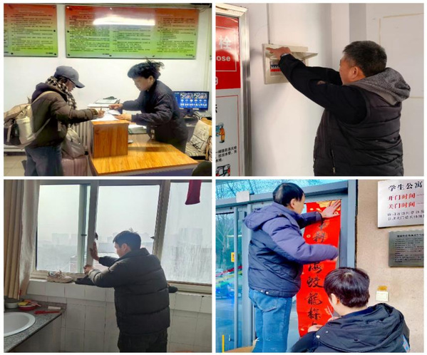 宿舍服务细致入微。后勤与学工部紧密协作,动态摸排留校学生情况,科学安排住宿方案,逐间检修水电家具,每日开展安全巡查。在宿舍楼大厅张贴窗花和励志春联,营造浓郁喜庆的节日氛围,让留校学生在宿舍感受到家的温暖和新年的祝福。