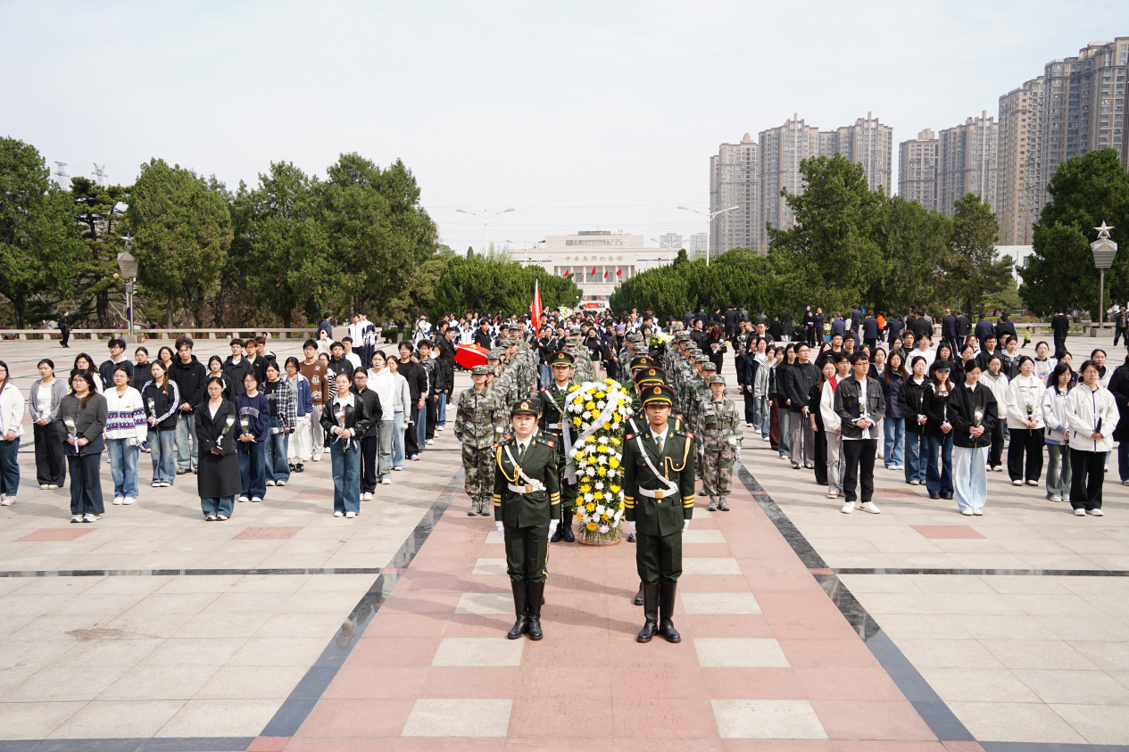 郑州烈士陵园内松柏苍翠、庄严肃穆,革命烈士纪念碑巍然矗立,师生方阵整齐列队、静静伫立。国旗护卫队队员迈着铿锵有力的正步,将满载敬意的花篮敬献于纪念碑基座前。全体师生垂首默哀三分钟,默哀结束后,大家手持白菊,依次瞻仰纪念碑,将鲜花轻放于碑旁,寄托对先烈的无限哀思。