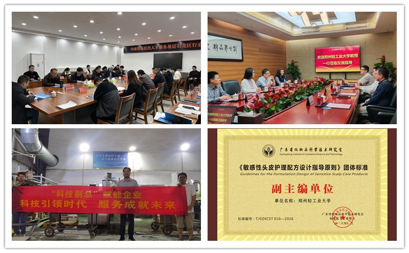 突出实干赋能,人才产业建设双提升。在河南纳星生物医药有限公司,对去屑剂己脒定二(羟乙基磺酸)盐的工艺进行优化,通过离心使母液套用10次,大大降低生产成本;以酸醇和氨醇溶液代替气体钢瓶,推动工艺环保化,降低生产事故发生。依托日用化工与化妆品领域科研优势和人才资源,学院作为核心起草单位深度参与《敏感性头皮护理配方设计指导原则》等三项团体标准研制,相关标准在2025化妆品科学技术年度峰会上正式发布。选派本科毕业生在企业完成毕业设计,推动建立校企实践基地,完善创新体系,为地方培育高素质创新人才,增强企业发展后劲。