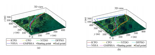 图1 不同算法的无人机路径规划三维效果示意图