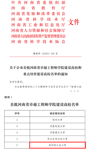 8月,河南省委组织部、河南省教育厅等8部门联合发布《关于公布首批河南省卓越工程师学院建设高校和重点培育建设高校名单的通知》,学校成功入选首批河南省卓越工程师学院建设高校。