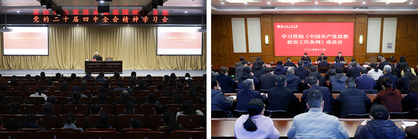 10月,学校召开校党委理论学习中心组(扩大)学习会,专题学习党的二十届四中全会精神,研究宣传贯彻落实工作。召开全会精神融入思政课结对提升集体备课会、讲师团集体备课会,各级领导干部、党委讲师团、青年讲师团面向全校各级党组织、团学组织、学生班级开展多层次、立体化的全会精神宣传宣讲,持续掀起学习贯彻全会精神热潮。12月,学校召开学习贯彻《中国共产党思想政治工作条例》座谈会,不断提升学校思想政治工作的科学化、规范化水平。